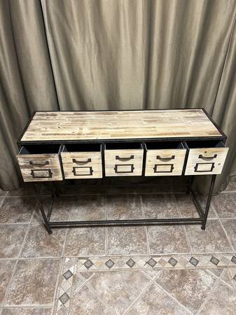 Rustic Console Table with wood and wrought iron, features 5 drawers in good condition with normal wear and tear. Dimensions: Tall-32" Wide-47" Deep-16" Can also be used as a side table, study desk, laptop desk, sofa table, entry way table, hall table, foyer table, tv stand, sideboard, buffet, vanity desk, storage shelf, led stand, lcd stand, media stand- $125