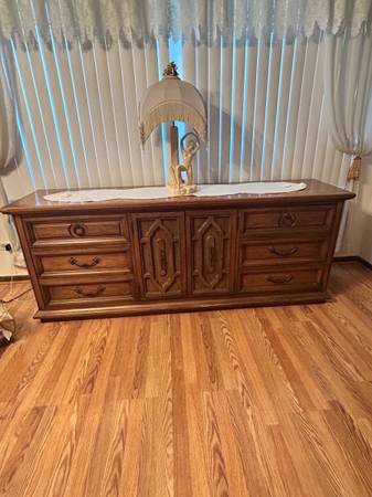 Beautiful wood- long dresser, armoire, bed, 2 night stands