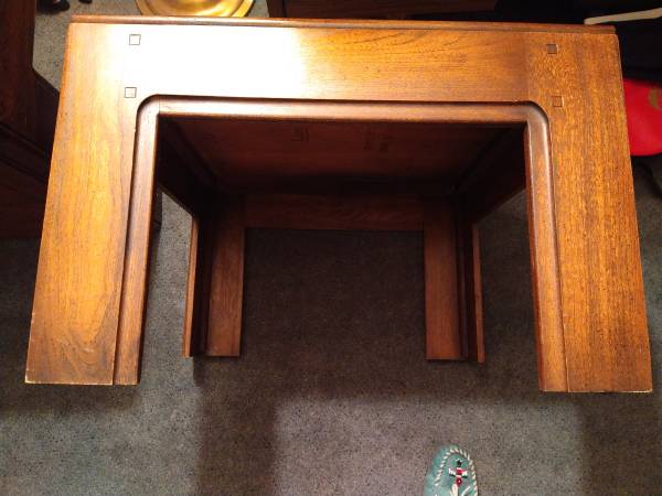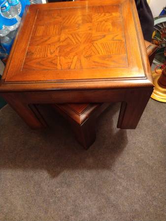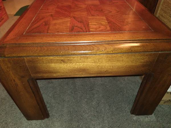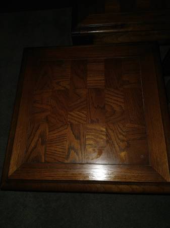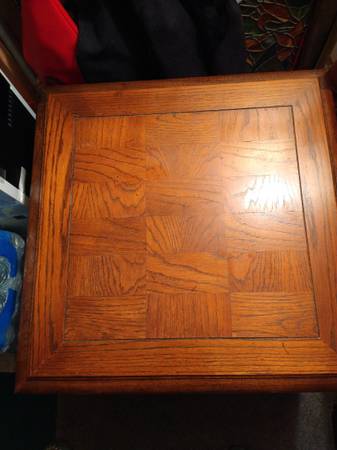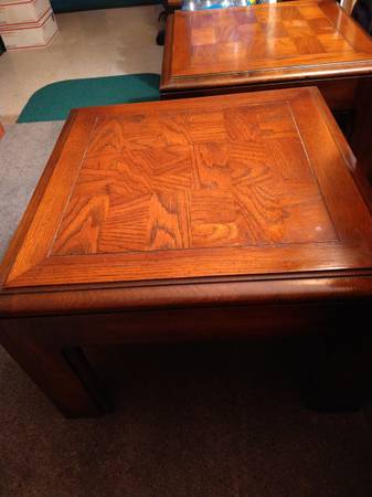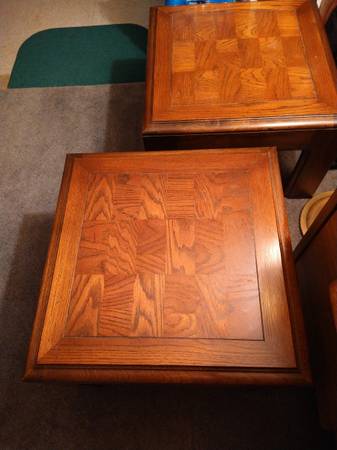 Gently Used Pair of Lane Furniture Oak Rustic Americana Parquet 22" Square 15 1/2" High End Tables. Model #1396-18 Serial Numbers 2176211, 227824. If it is listed it is available. Cash only.