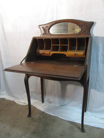 Some minor scratches and defects due to age, but very nice condition. Drawer slides easily, writing top and hinges folds down, both locks are functional. Everything is square and solid. NO KEY!