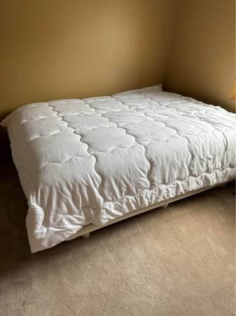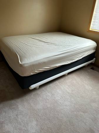 Like new sturdy no wobble white steel vinyl clad 5000 lb sturdy frame and Tempur-pedic charcoal queen platform is $500 cash.