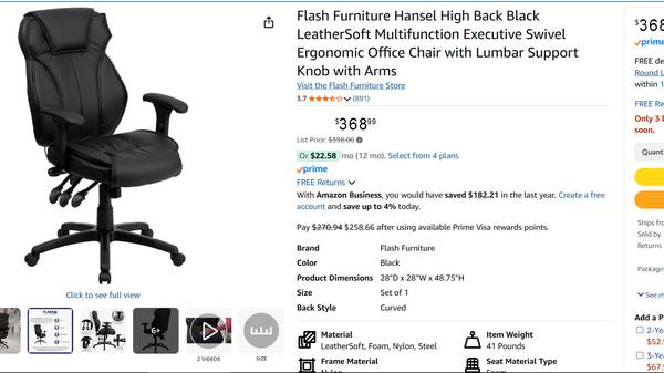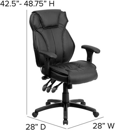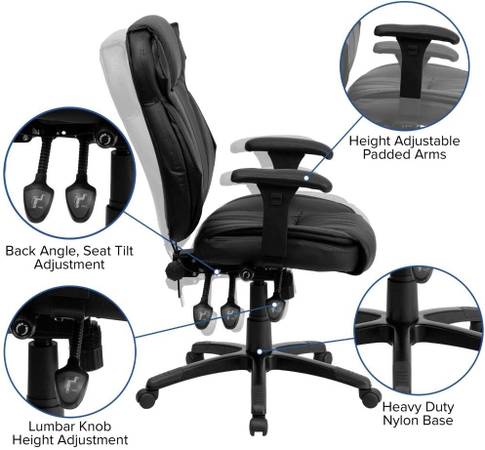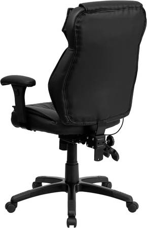 This attractive LeatherSoft office chair is loaded with options to maximize your comfort and productivity when you're working long hours. Its high-back, integrated headrest and built-in lumbar support help prevent back strain. You can increase lumbar support using the pressurized lumbar support knob. The padded swivel seat is filled with 3" of foam and features a waterfall edge. Height adjustable padded armrests take pressure off your shoulders and neck. Easily adjust the seat's back angle, seat height and tilt angle with three paddle mechanisms conveniently located under the seat. The infinite-locking back angle adjustment helps reduce disc pressure by changing the angle of your torso. Turn the tilt tension adjustment knob to increase or decrease the amount of force needed to rock or recline and lock the seat in place with the multi-tilt lock mechanism. LeatherSoft is leather and polyurethane for added softness and durability. This ergonomic chair is a stylish addition to any workspace.