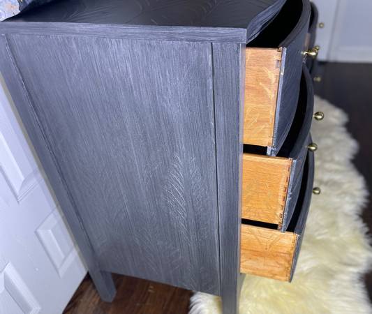 Front and back dovetail drawers. All the drawers are working very good and are lined with new contact paper, extremely clean. Lots of storage. Solid wood. Very sturdy. Upgraded gold hardware. Raised stencil added. Can fit in almost any decor or any room: kids, guest room or extra storage and organizing purposes.