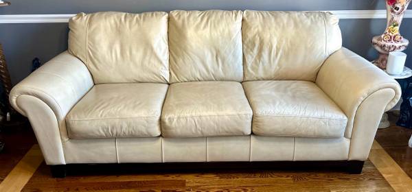 This Genuine Leather Sofa is Cream in Color. It is a 3 Seat with rounded arm rests. Leather piping on arm rest and backrests for additional detailing. The Backrest are cushioned for comfort. The seat cushions have Velcro on each cushion to secure the seat in place.