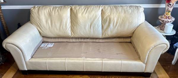 Leather Sofa-Ashley Furniture-Cream Color. 3 Seat with Cherry Color Wood Trim- Used in good condition.