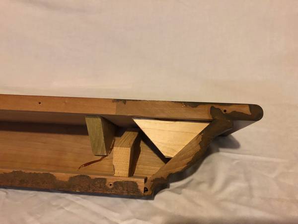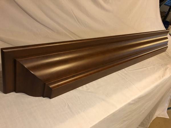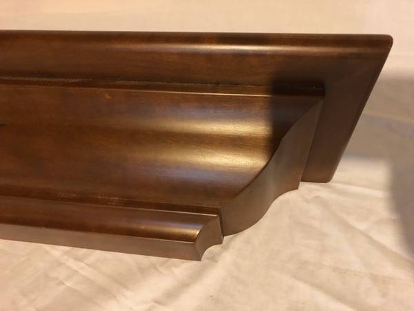 Hardwood Mantel; deep brown finish; 57 inches wide; 4 ¼ inches tall; top 6 ¾ inches deep; does not include mounting devise/hardware. Palatine area