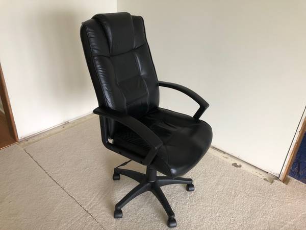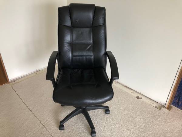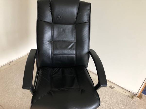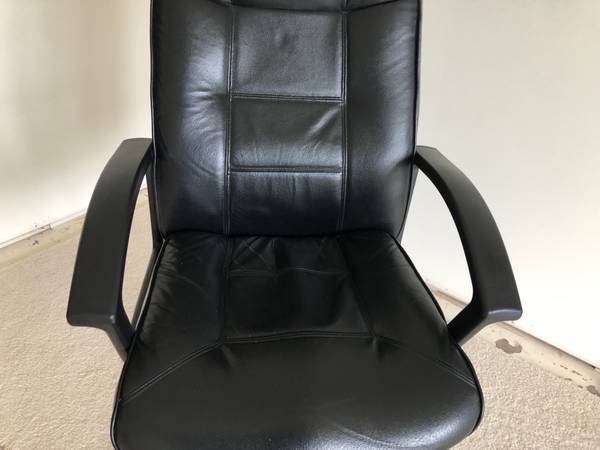 High back office chair; adjustable height; swivel; rear tilt; seat width 20 inches, width with arms 26 inches, chair back 30 inches high, 5 castors, plastic base and arms; Faux leather like material, general good condition, indentation on upper back and small tear on side