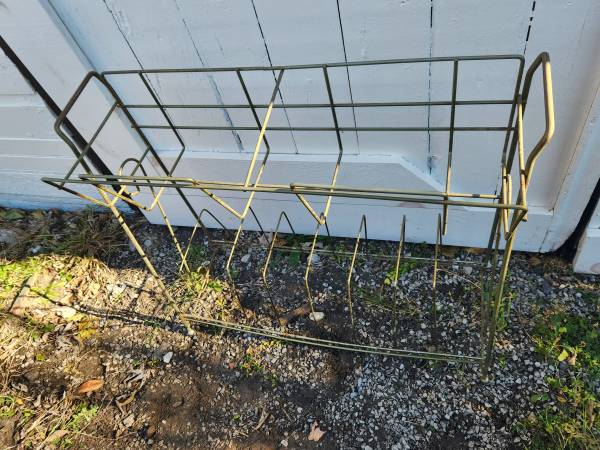 MCM vintage brass-toned metal rack/holder for your records and/or magazines. Features a two-tiered design, with the lower section having dividers suitable for holding vinyl records (LPs) and the upper section for magazines or books. A versatile item often used in living rooms, near easy chairs, or next to a stereo system. In good vintage condition.