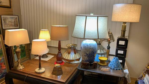 All sizes, types of Tiffany Style Lamps and Shades. More variety than pics shown. Prices starting at $45 each, and all 1/2 or less than retail. Lamps and shades range from Excellent to Very Good condition, with some having minimal defects for reduced price.
