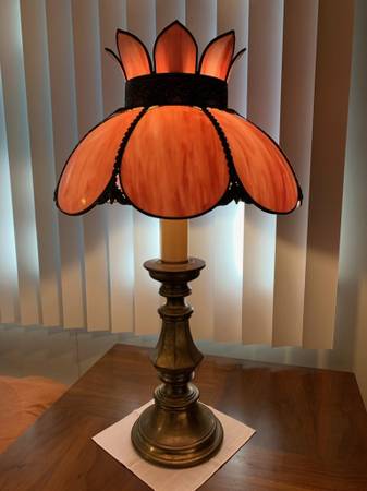 *Large Tiffany Style Lamp with Heavy Brass Base and Pinkish Amber Shade: $230