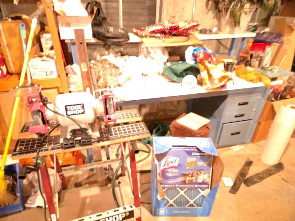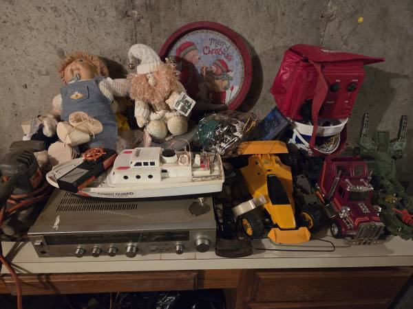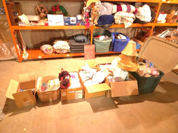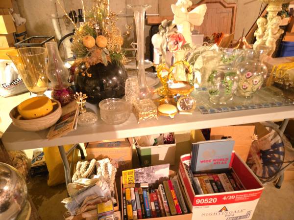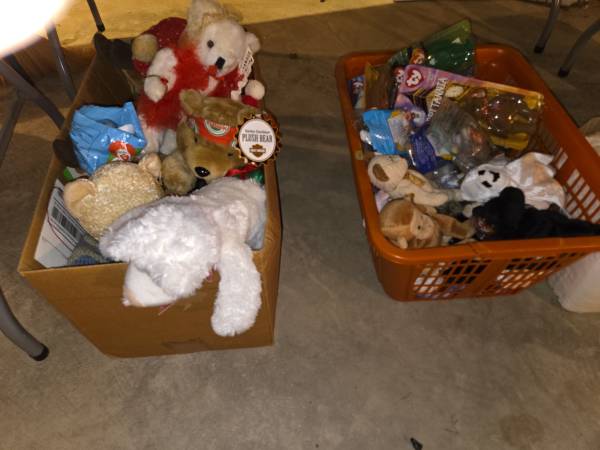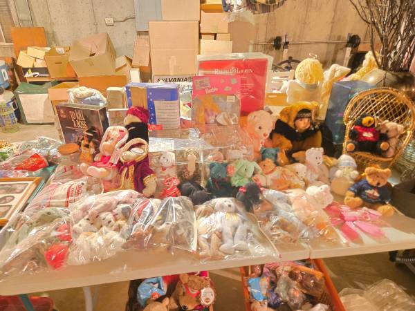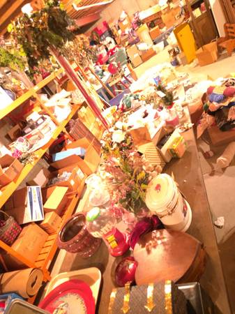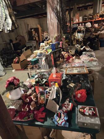 Household items, Decor pieces, luggage, exercise bench, bike, seasonal decorations. Beanie babies. Stuffed animals, Madame Alexander dolls, Barbies. HUGE collection of CHRISTMAS decorations- full set of Christmas China and glasses and linens. Majority of items in basement. Cash only.