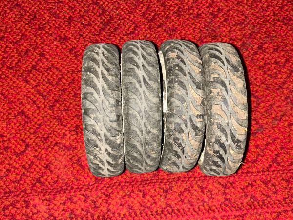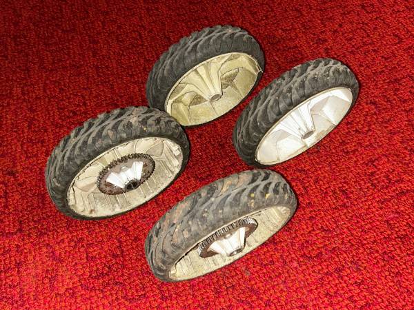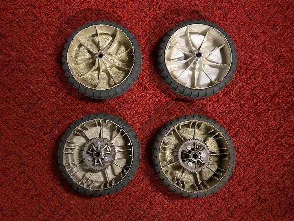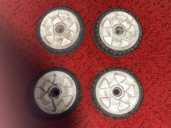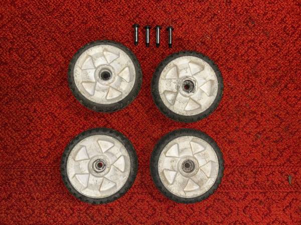 Set of 4 8" Toro wheels (2 front wheels, 2 rear wheels) and 4 axles / shoulder bolts from a Toro 22" self-propelled lawn mower, model 20332. The wheels show some wear but they worked fine and are not extremely wobbly.