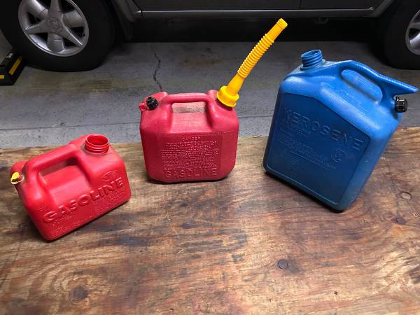 3 old style vented gas and kerosene cans. All are clean inside. The 1 1/2 gallon can has a brand new spout, the others don't have one (cheap to replace). $25 for all 4 cans.