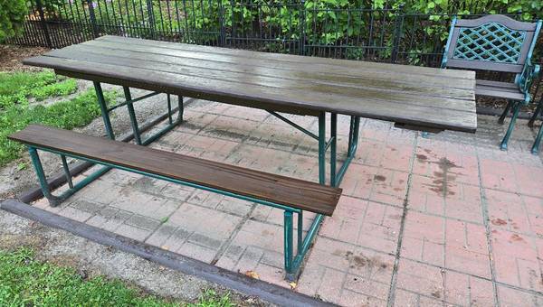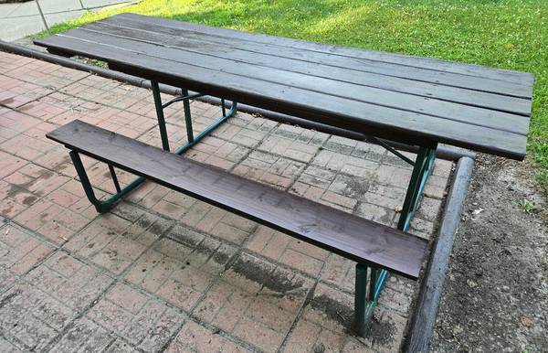 Wood Table Top, Metal Base, Wood and Metal Seats