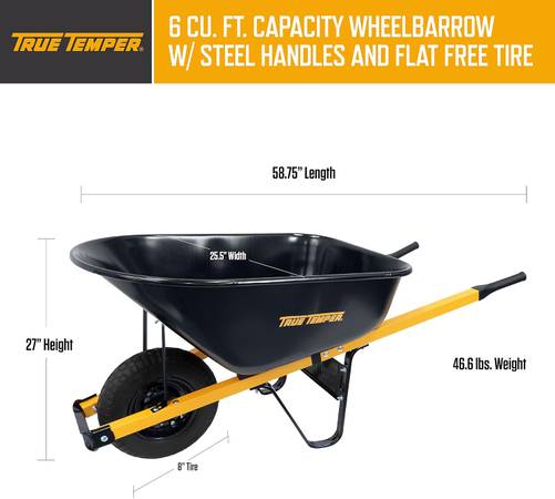 With 6 cubic feet of hauling capacity, the True Temper 6 Cu. Ft Steel Tray Wheelbarrow is ideal for homeowners, landscapers, and light construction work. The 6 cubic foot seamless steel tray is plenty tough and will provide years of service for just about any job. The solid, never-flat tire never requires air, so your wheelbarrow is always ready to work. Around the house or on the job, this is the right wheelbarrow for the job. This unique wheelbarrow is designed for convenience to ship in one durable box, with quick & easy assembly.