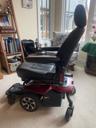 Purchased new for $ 4.500; Used sparingly, mainly to go to doctor's appointments over the last 4.5 years. Location is a Retirement Center (The Garlands of Barrington in the NW suburbs of Chicago). Comes with the battery charger. Also, has a new battery. Three hundred (300) lb weight capacity; 24.25" turning radiusUp to 4 mph maximum speed (elevated and non-elevated). Per charge range: up to 16.6 miles at 220 lbs. Fast Rise: 12” of power adjustable seat height in 11 seconds. Active-Trac® Suspension provides enhance d performance and maximum stability both indoors and out. Bright LED lighting for visibility in all environments. Adjustable armrests. Angle height adjustable headrest. Raises and lowers by using the joystick. Integrated foot platform with rubber insert and 2" of adjustment for comfort in both the elevated and non-elevated positions. Single-sided caster forks for enhanced maneuverability.