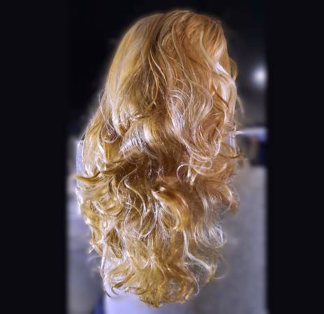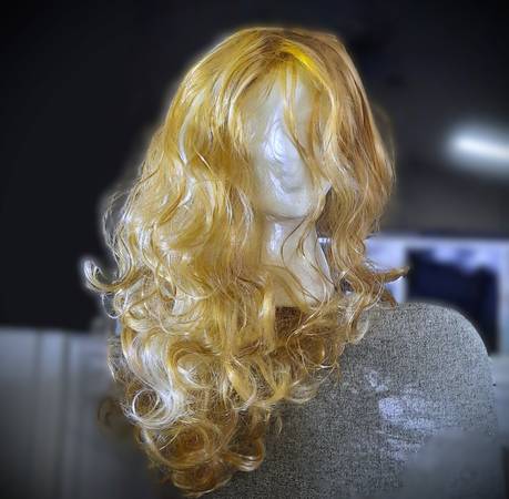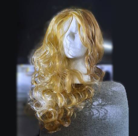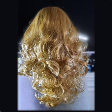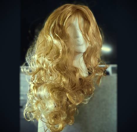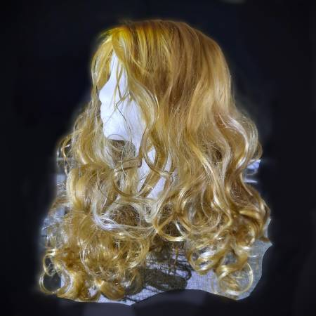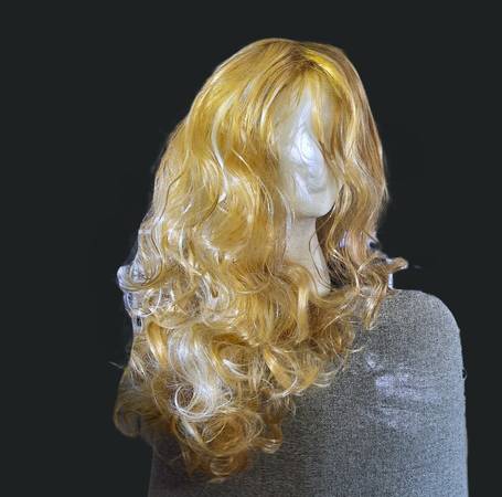 Wig blonde gold long 20" (25" if stretchered) curls glossy highlighting women men