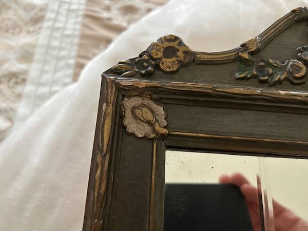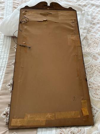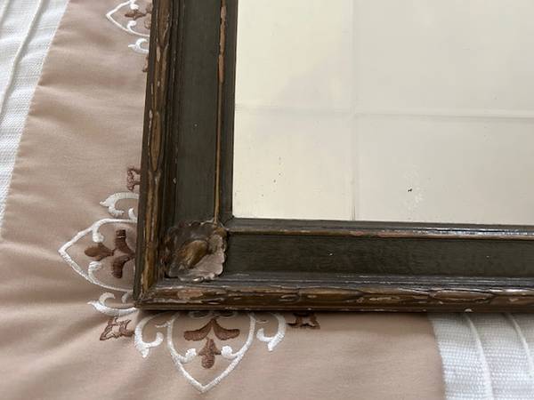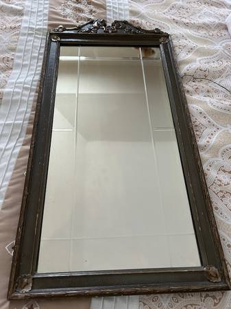 Antique Beveled Mirror - Mirror Measures 11 1/2" Wide X 23 1/2" Tall - Mirror With Frame Measures 14 1/2" Wide X 29 1/4" Tall - Frame Is Wood With Metal Fasteners At Corners - Mirror Shows Signs Of...