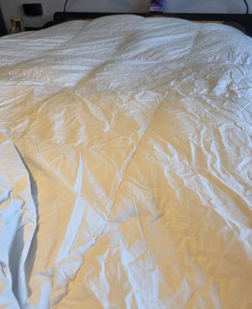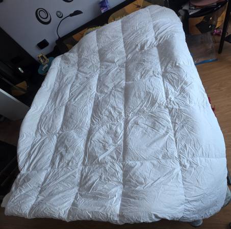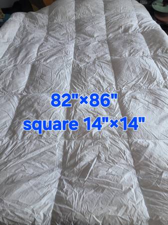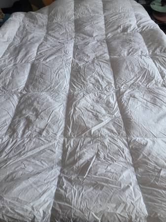 Soft and warm genuine down-filled comforter (not down-alternative). Clean, no stains or tears. Still fluffy and lightweight. Size 87" x 78" and 78"x82"s Full or Queen bed. Perfect for cold weather...