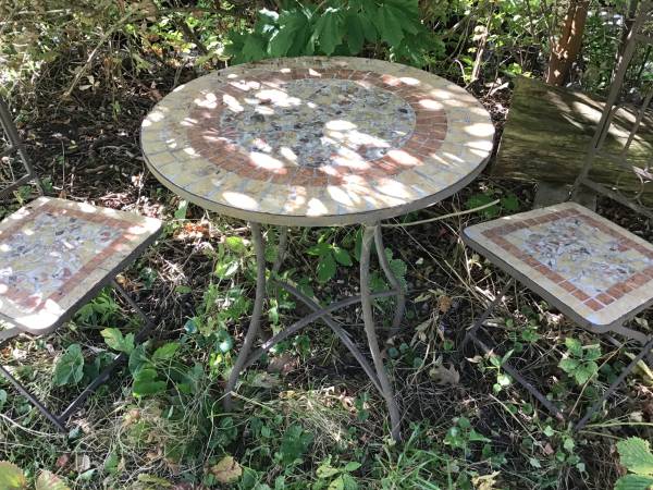 Nice cast iron lawn table and two chairs with ceramic tile surface. Very heavy duty.