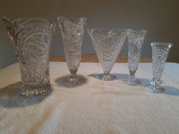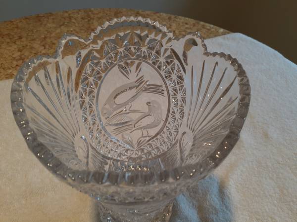 Hofbauer Byrdes pattern Crystal - Vases Large Vase - 10.25"H X 6.25"W Sculptured Top - pictures # 3 - 4 - $50 2nd Large Vase - 10.5"H X 4.5"W Sculptured Top - pictures # 5 - 6 - $15 2nd Small Vase...