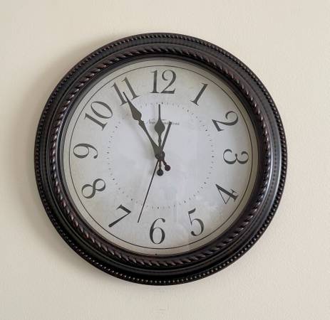 This 16-inch wall clock by New Traditions combines coastal, rustic, and southwestern styles to create a unique design that complements any room in your home. The clock has a round shape with a bronze finish and a heavy plastic frame. It features an analog display with Arabic numerals and a clock face made of glass. The clock is powered by one AA battery and has a quartz movement. This hanging wall clock is perfect for your living room, home office/study, or hallway. The clock weighs 4.2 pounds and has a depth of 2.5 inches.
