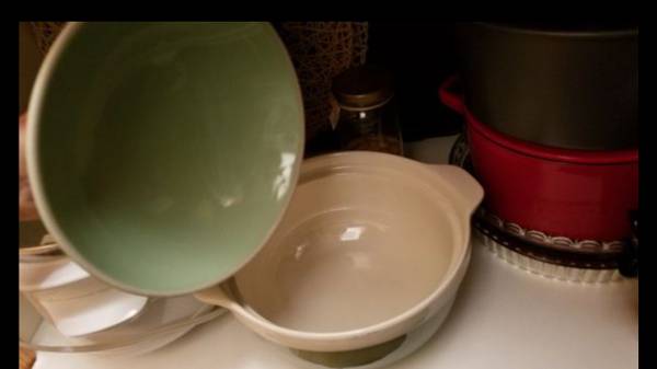 Like new condition. 6" high. 11" diameter. Microwave, dishwasher, and oven safe. Pet free, smoke free home.