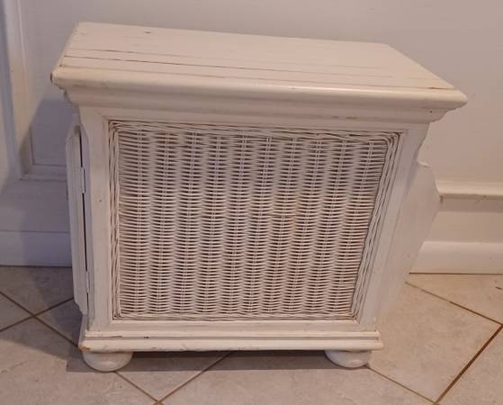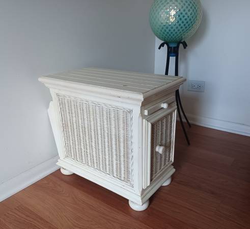 Vintage white wicker drawers / nightstand - white wicker - large wicker Cabinet space with shelf - pull-out writing board - heavy quality wood height
