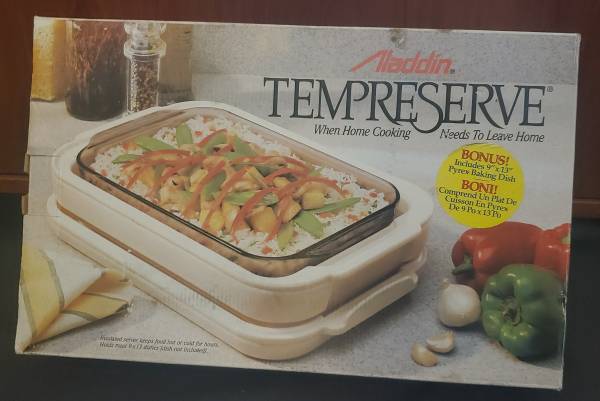 Vintage Aladdin Tempreserve Serve-N-Heat insulated carrier comes with a 9 in x 13 in Pyrex casserole dish. This oldie but goodie has a tight seal when carrying your food to gatherings and keeps food hot or cold for up to 4 hours inside the Tempreserve insulated server and comes with original box.