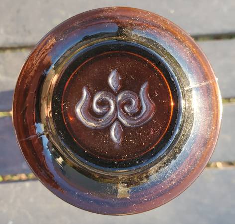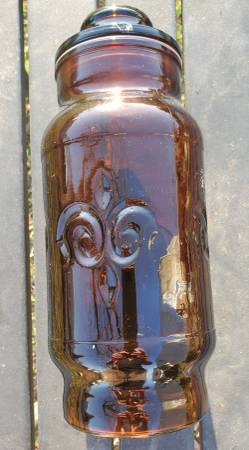 Vintage (Circa 1970's) Dark Amber Apothecary Glass Jar with a Lid featuring a Fleur de-lis design. A charming retro jar to add to your collection.