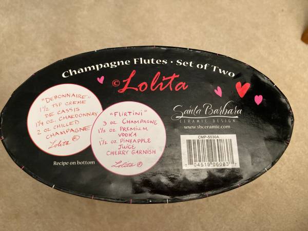 Lolita hand-painted glasses are very playful, whimsical and probably the most unique glassware in the world today! Each glass features a delicious cocktail recipe inspired by the glass that is painted on the bottom. The glasses are hand painted with food-grade non-toxic paint and must be hand-washed. They are created by Tracy "Lolita" Yancey of Santa Barbara Design Studio. All of them are sold-out limited editions and most of them are no longer available for sale.