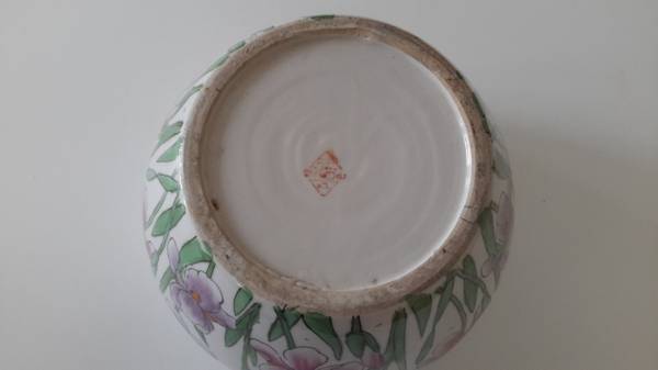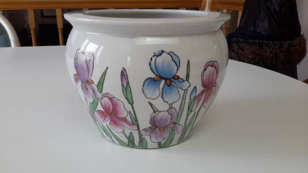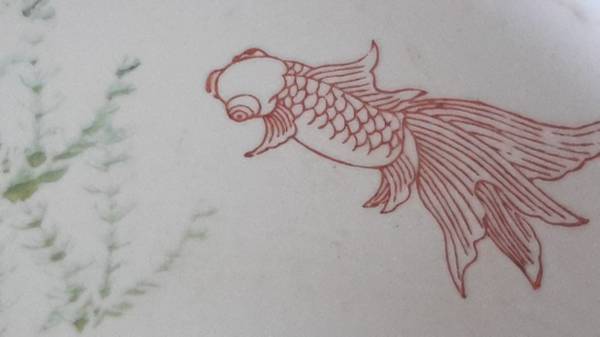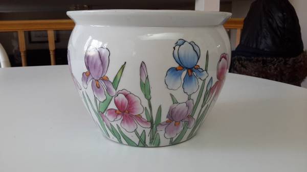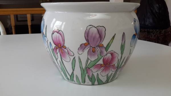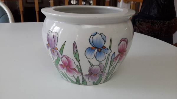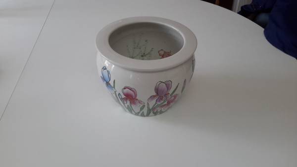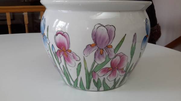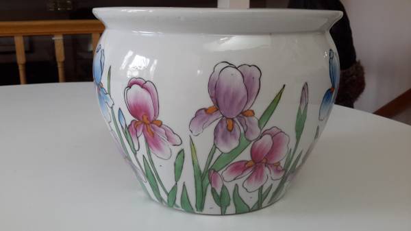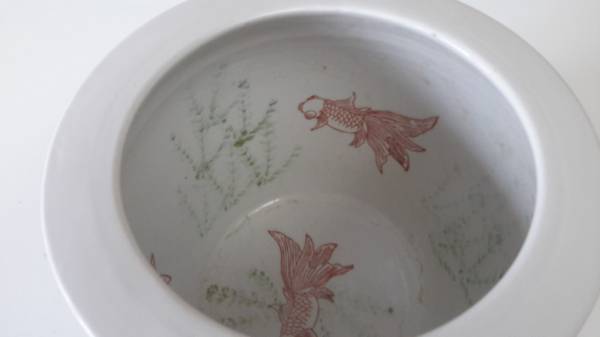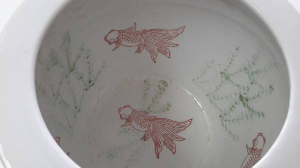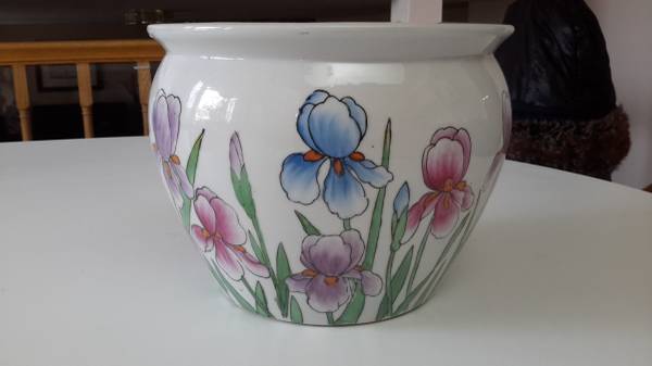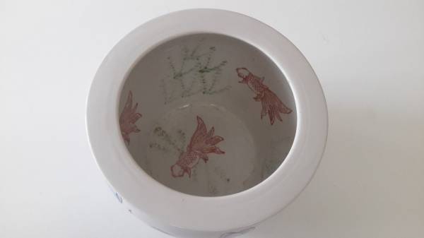 Chinese Large Koi Fish Bowl Pot Planter Iris Flower White Signed Glazed VTG 1960's