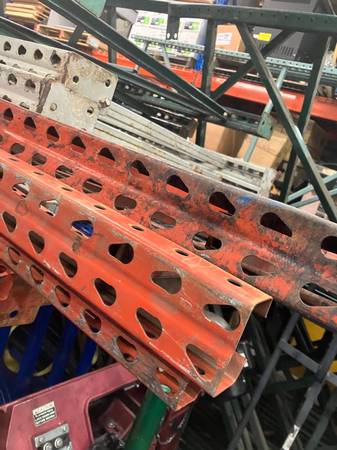 Heavy-duty industrial pallet racking uprights in teardrop style, measuring 14 feet tall and 48 inches deep. These are low-grade units—sold as-is—and are best suited for: