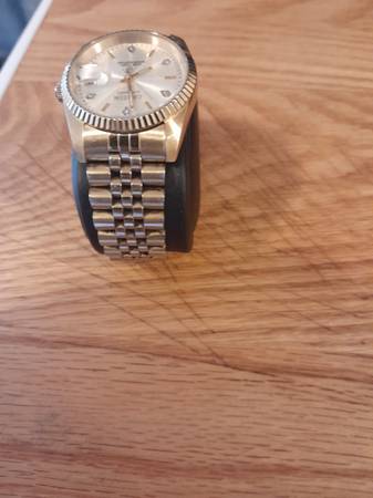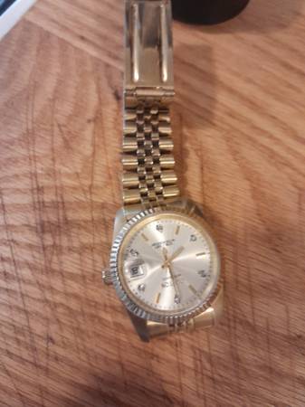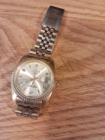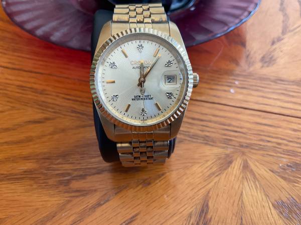 Croton Men’s Automatic Watch Fluted Bezel Champagne Dial 6 Stones Date Quick Set Water Resistant 5 ATM 165 Feet All Signed Croton Jubilee Bracelet circa 1980’s Japan Good Condition . Some wear on bracelet, see pics.