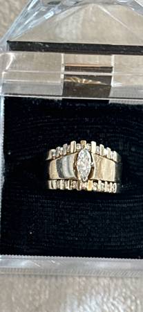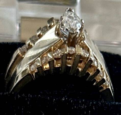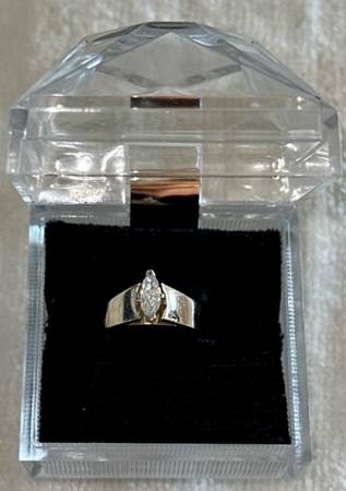 Engagement Ring- Stunning and Sophisticated! Genuine Diamond Marquise Shape Center Stone 0.30 pts total Carat weight. Diamond measures approximately 3/8” long and 1/4” wide. High polished thick Gold Band. Clarity of the Diamond is VS2 and G-H in color (near Colorless). Diamond is hand set and secured with 4 Prongs.
