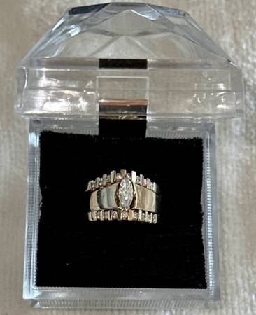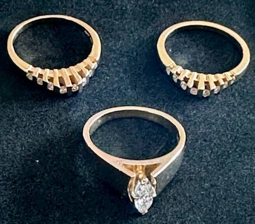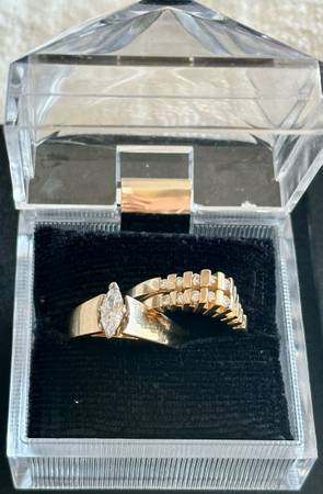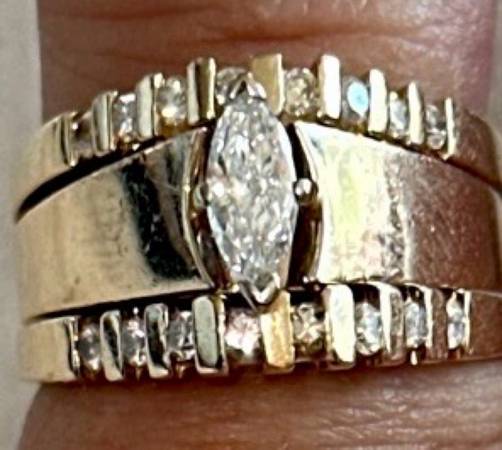 14K Solid Yellow Gold Marquise Genuine Diamond Engagement Ring / and Stacking Diamond Wedding Band Ring Set of 3 Rings !!