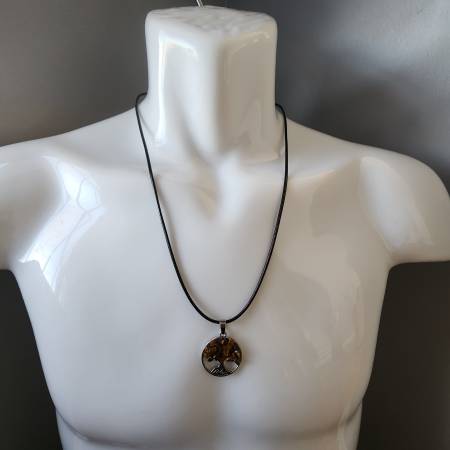 Astra is a round Tree of Life pendant featuring a cutout metal design with polished Tiger’s Eye stones placed throughout the branches.