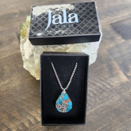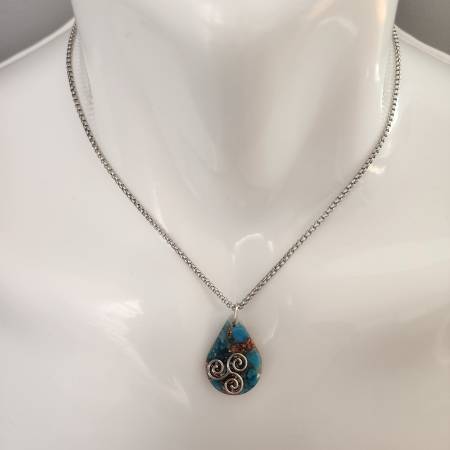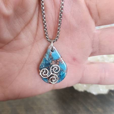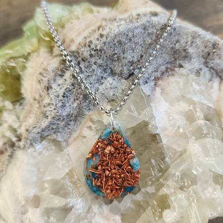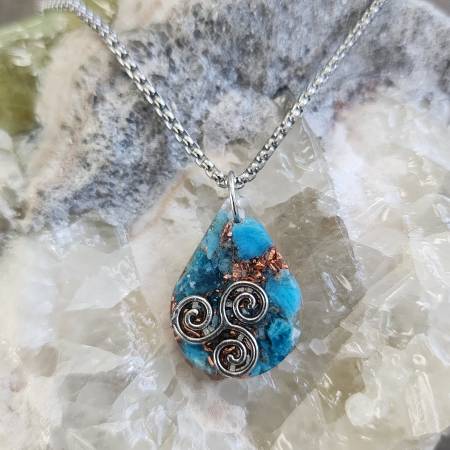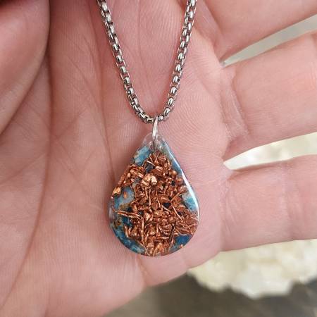 This handcrafted Teardrop orgonite pendant features vivid Apatite crystals paired with copper for a striking, modern aesthetic. It comes with a 2 mm stainless steel chain, 17.7" (≈ 45 cm) long, and weighs 0.4 oz