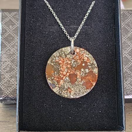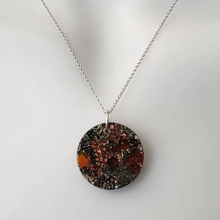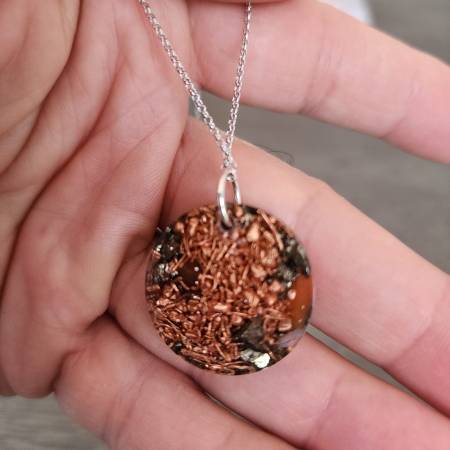 This elegant pendant blends the energetic power of Pyrite and Carnelian with copper and resin to balance your energy field while shielding from EMF exposure. Finished with a genuine 925 sterling silver chain, it’s both a meaningful energy tool and a timeless piece of jewelry.