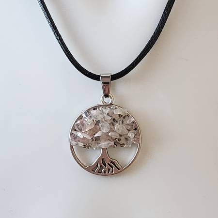 Serena is a round Tree of Life pendant featuring a cutout metal design with polished Rose Quartz stones placed throughout the branches.