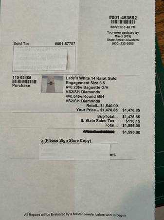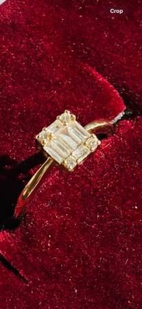 *Lady's 14 Karat Gold, that is stunning in looks. *Engagement Size 4.25 6=0.20tw Baguette G/H VS2/SI1 Diamonds 4=0.04tw Round G/H VS2/SI1 Diamonds *Bought for….$1,595.00 Selling for…...$895.00...