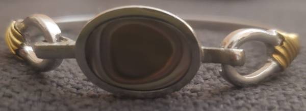 Vintage Avon (circa 1970's) Abalone shell bracelet with silver and gold-tone rope accents on the sides that is secured with a clip.