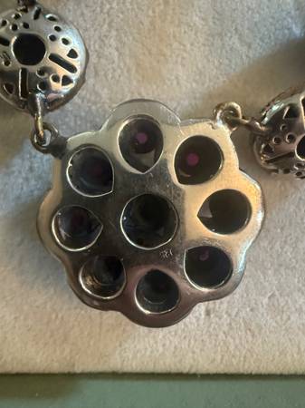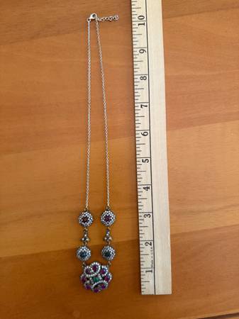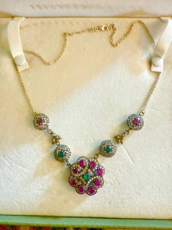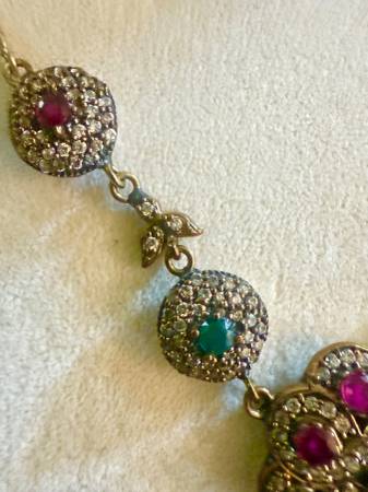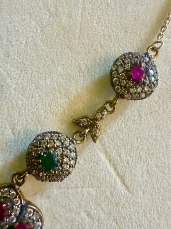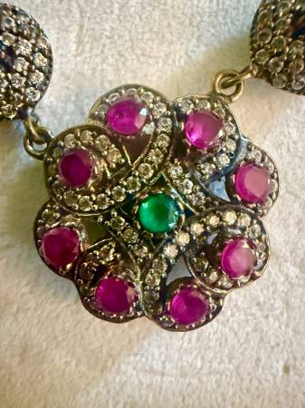 Vintage Sterling Silver 925 Gemstone Necklace This is a necklace fit for a queen. Encrusted with lab-created rubies, emeralds, and white sapphires in handcrafted settings.