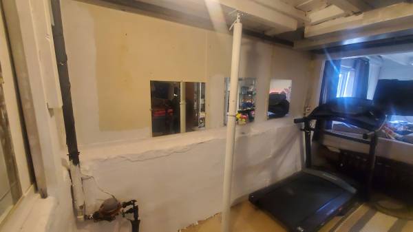 Currently cement wall goes up halfway and has paneling On the top half. Will have to work around ductwork on the ceiling and move electrical outlets. 1 wall is about 23ft long with a large window to frame around and the other wall has a staircase and small window to frame around.