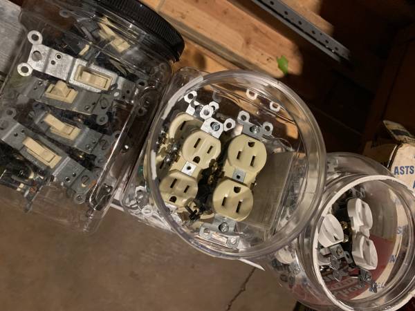 Lots: of Electrical Boxes (1900 2 gang, 1/2 size single gang boxes, also round and octagon), Covers, Connectors, Conduit, inclding flexible BX; Ceramic light sockets, with or without outlets; Light Switches, etc