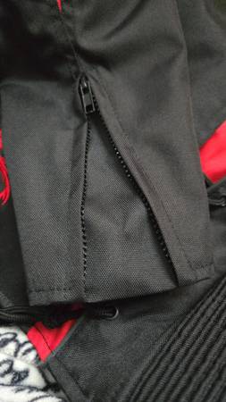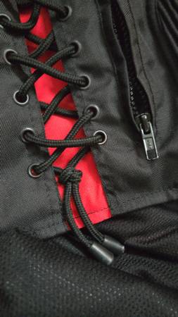 Color Black and Red. Has a butterfly on the lower back. Pads where they are needed on a motorcycle jacket for your protection.