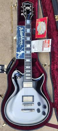 This Washburn USA Idol was built for Sonny Mayo and used for promo catalog photos, purchased directly from the Washburn USA Custom Shop and has never left my smoke-free home. At the time of the photo shoot, its release was being considered as the Sonny Mayo Signature model. It has a mahogany body, carved single-cutaway maple top, belly contour cutout (not found or available on a Gibson Custom Shop Les Paul Custom), 2" thick, and weighs ~8.5 lbs. With Tone Pros stop tail and tune-o-matic bridge, 2-piece mahogany set neck, ebony fingerboard, block inlays (MOP), 22 jumbo frets, a 24.75" scale, it's perfectly intonated to 0 cents at open and the 12th fret, and upgraded 50s wiring with paper in oil capacitor and upgraded 500k potentiometers.
