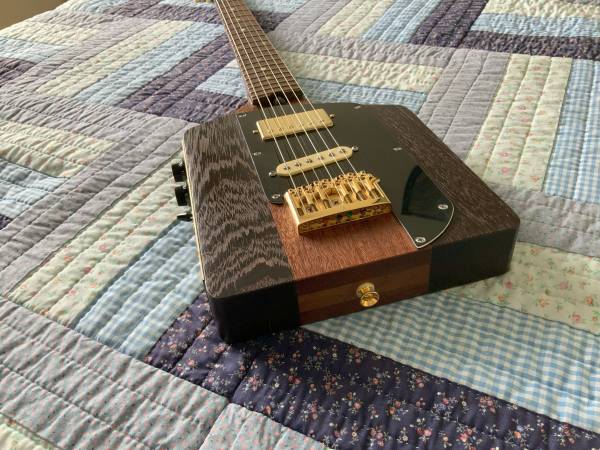 Michael Walch, luthier of Trenchtown Guitars in Oakley, CA, built this custom neck-through CB-1. It features a Cumaru [Brazilian Teak] neck with Central African Wenge body wings attached to create the compact body shape. The inspiration for the shape is a cigar box design.
