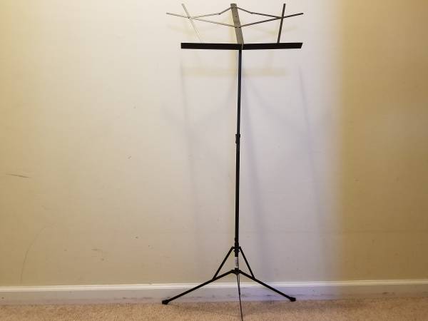 Metal foldable music stand with Velcro closure carrying bag. No scratches or dents. From clean, smoke free home. Cash only, pick up in Schaumburg. Firm on pricing.