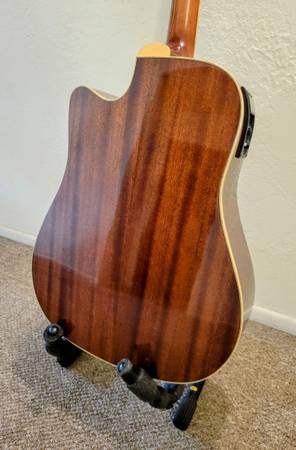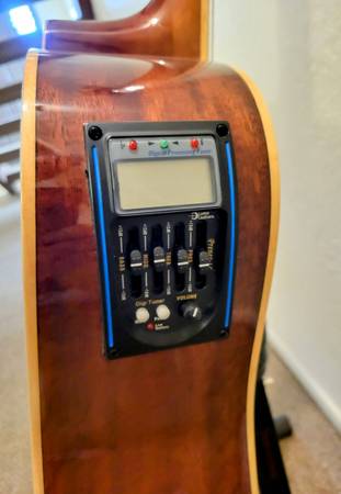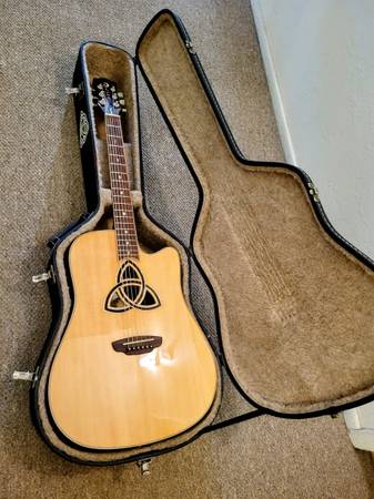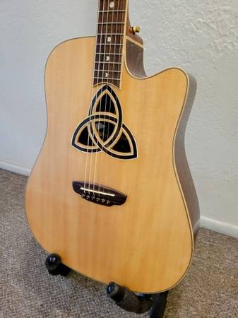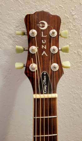 This is a VERY RARE Irish Acoustic/Electric Guitar made by Luna, now discontinued, with Hardshell case. This has been used only as a display piece in our home and shows absolutely no fretwear or pickguard scratches. The finish is flawless.